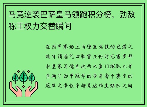 在足球世界中,没有比马德里德比更引人注目的比赛了。每当马德里竞技与皇家马德里迎面而来,那份硝烟弥漫的对抗总是让球迷们心潮澎湃。今年的德比大战同样备受关注,尤其是弗兰和托尼斯的闭门合练,成为了焦点中的焦点。为了确保能在主场战胜强敌巴萨,马德里竞技队已经进入了紧张的备战状态。 弗兰,作为马竞的核心球员之一,近期的状态极为火爆。无论是在进攻端还是防守端,他的表现都堪称完美。为了应对即将到来的巴萨,弗兰和...